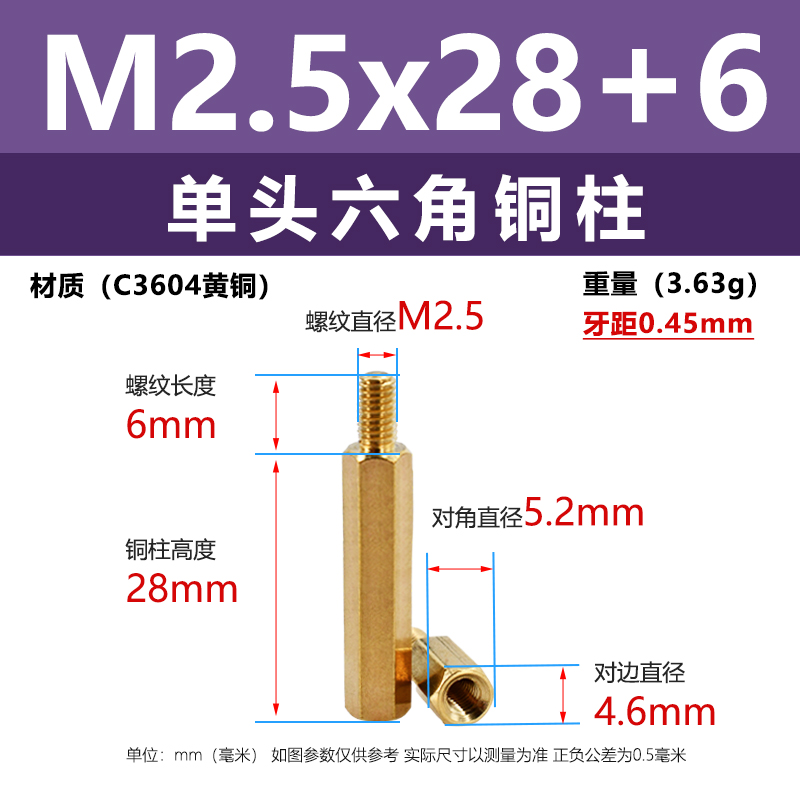 螺纹规格为M2.5,牙距0.45mm,螺纹长度6mm,确保与标准螺丝良好配合;铜柱总高度28mm,对边直径4.6mm,对角直径5.2mm,尺寸精准,正负公差控制在±0.5mm以内,满足精密安装需求。