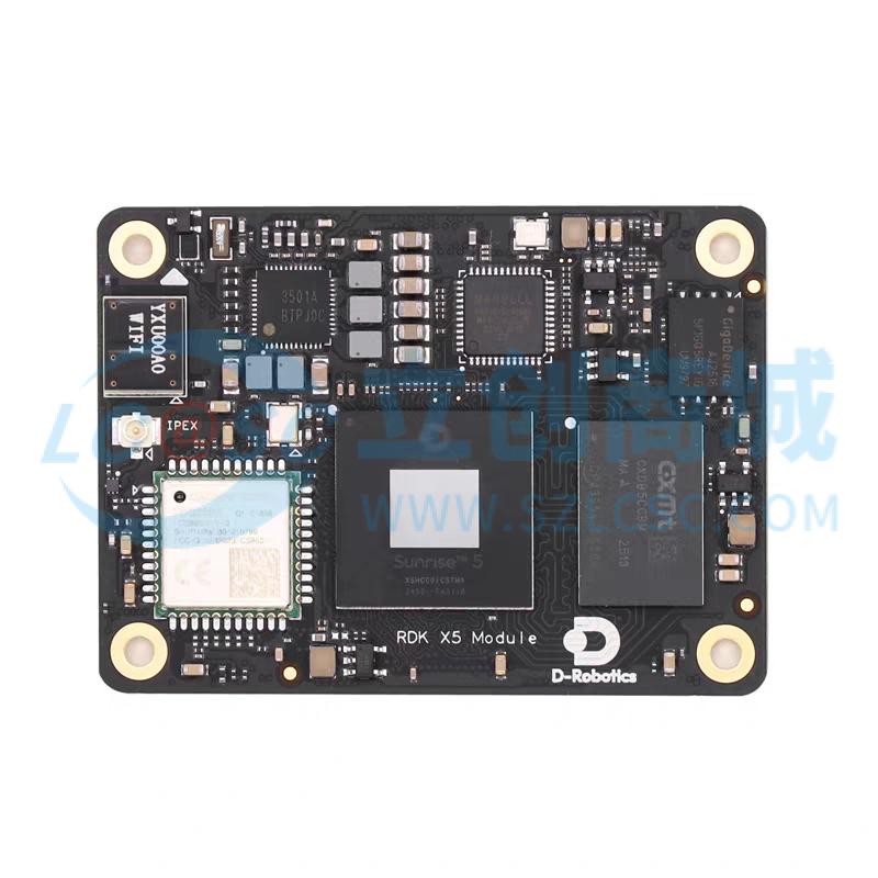 RDK X5 Module 主要特性包括8核ARM® Cortex®-A55处理器、10TopsBPU 算力、32GFlops GPU算力可选的板载RAM 容量包括 2GB、4GB、8GB、可选搭载双频2.4/5GHz无线模组,支持Wi-Fi 6协议和蓝牙5.4协议。搭载高性能的板载天线,且支持搭配外部天线套件使用;支持 4K@6H.264/H.265/M-JPEG 视频编解码;主要接口包括HDMI、千兆以太网、USB 3.0、MIPI CSI、MIPI DSI 等