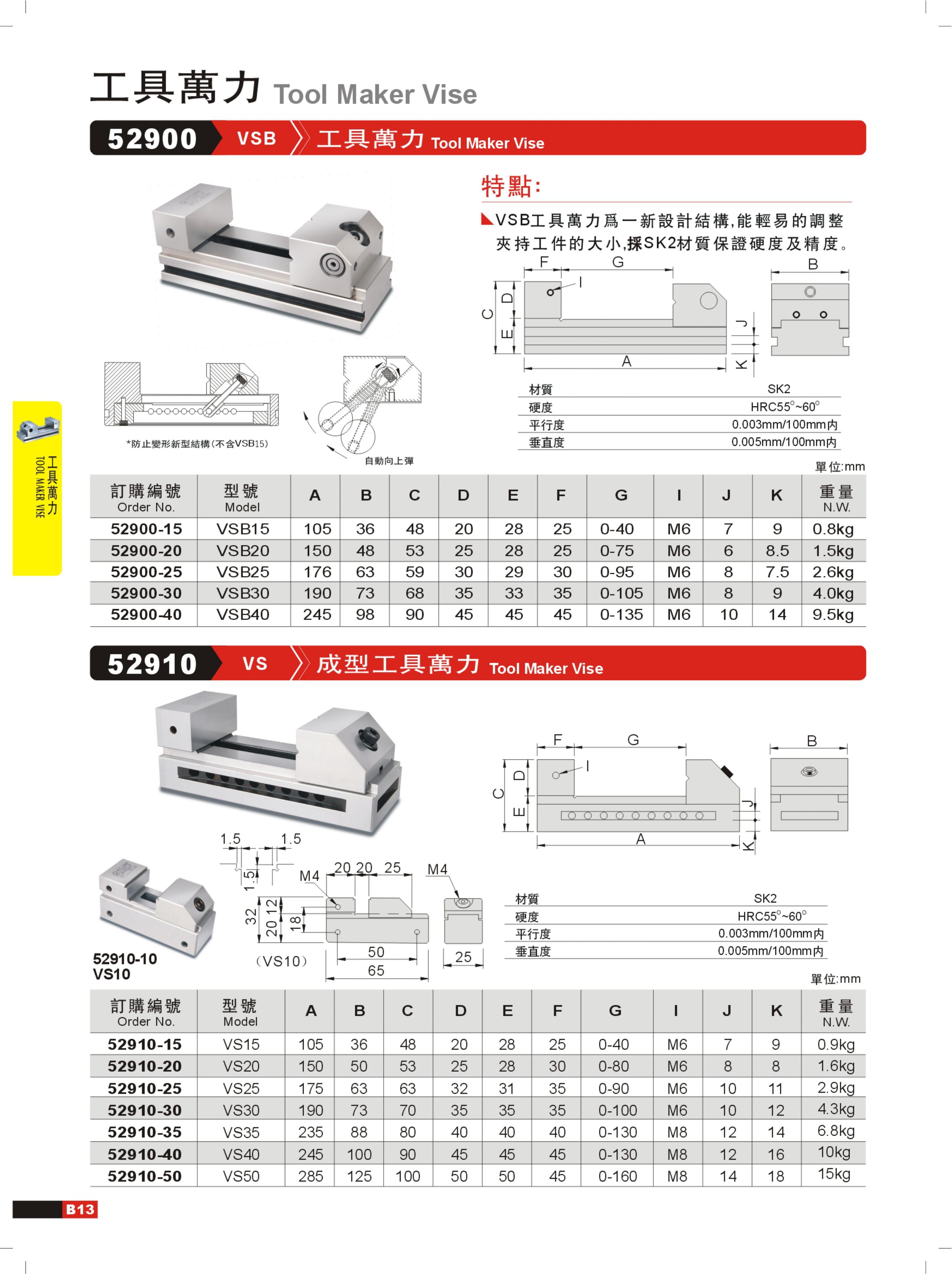 型号VS10(订单编号52910-10)参数:A尺寸105mm、B尺寸36mm、C尺寸48mm、D尺寸20mm、E尺寸28mm、F尺寸25mm,夹持范围0-40mm,重量0.9kg,适配M6螺丝
