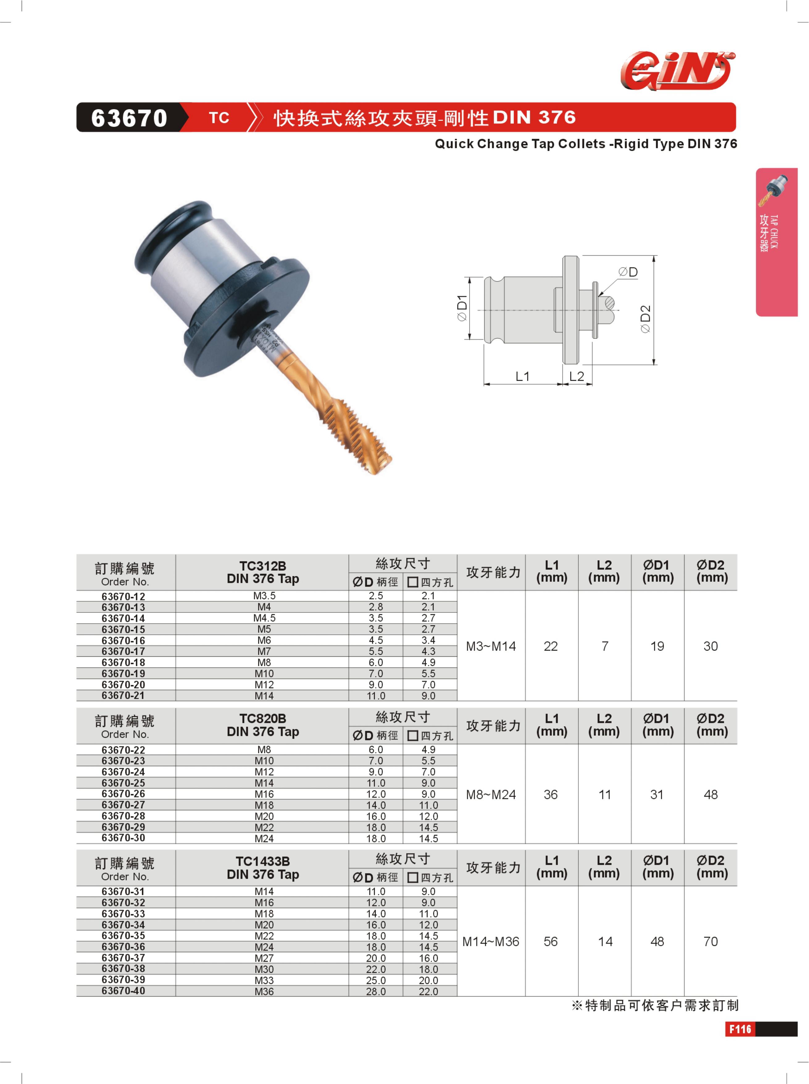 GIN(精展) TC820BDIN376 63670-22 快换式丝攻夹头-刚性DIN376