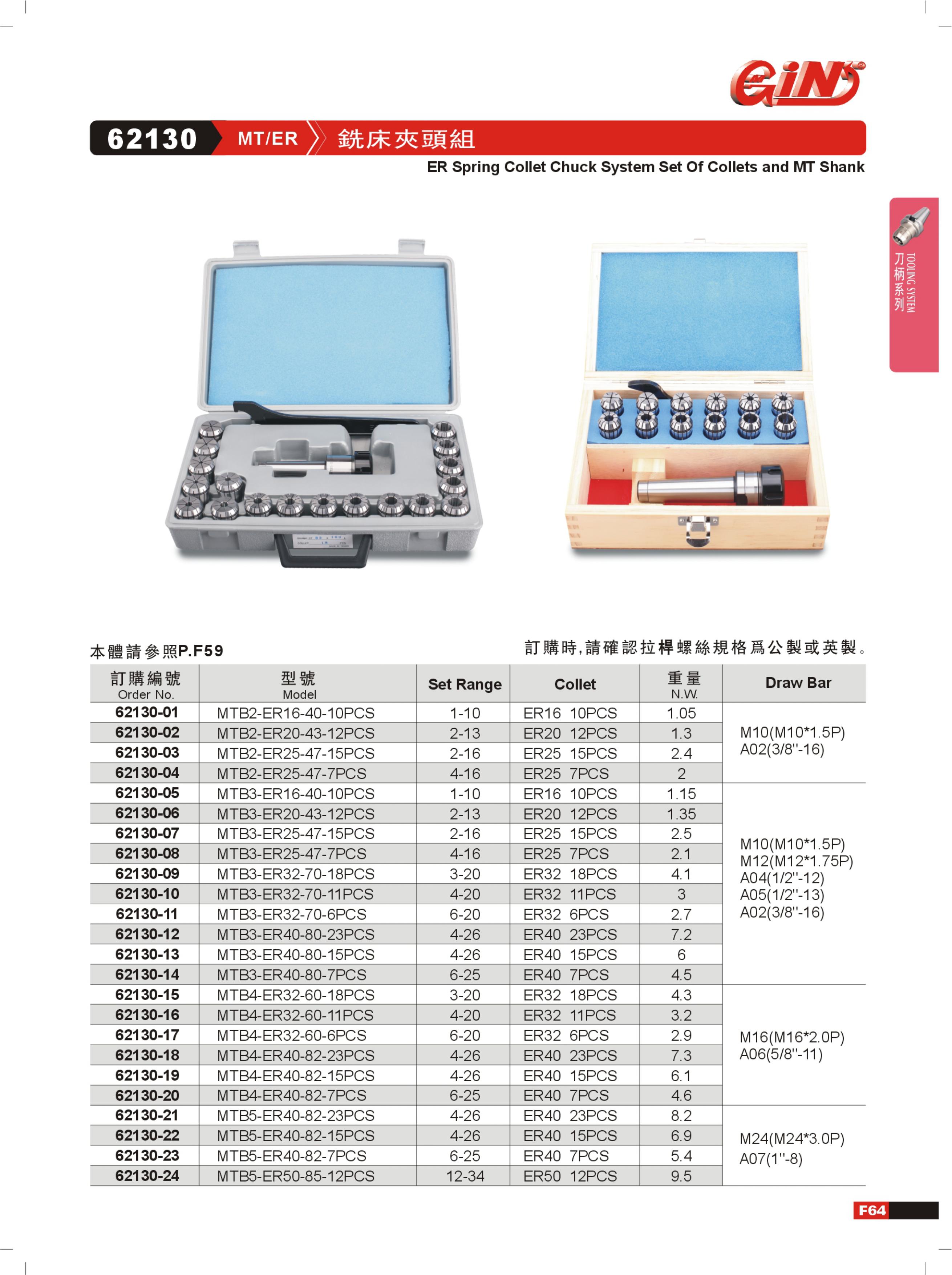 品牌为GIN(精展),型号62130-03A02对应的夹头组为MTB2-ER25-47-15PCS,包含15个ER25规格的弹簧夹头,夹持范围覆盖2-16mm,适配多种直径铣刀