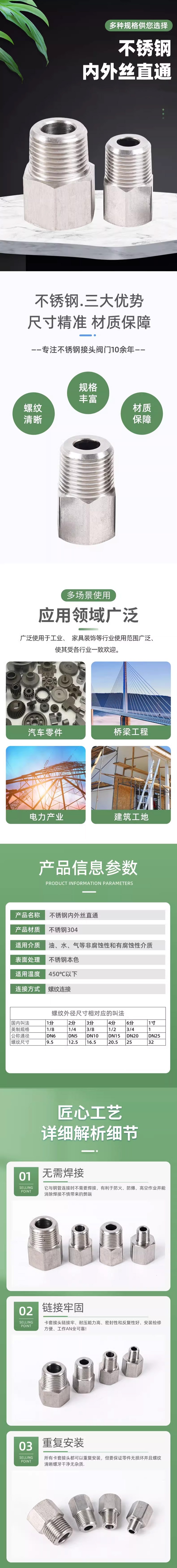威尔克VRK 304不锈钢内外丝牙转换接头 内M14×1.5-外3/8(3分) VKB636