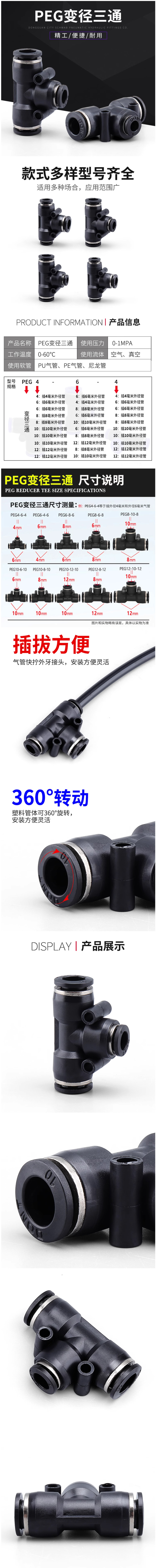 型号丰富:款式多样、型号齐全(涵盖PEG4-4-4、PEG6-6-6、PEG6-4-6等多种规格),适配不同管径气管的变径连接场景,应用范围广泛