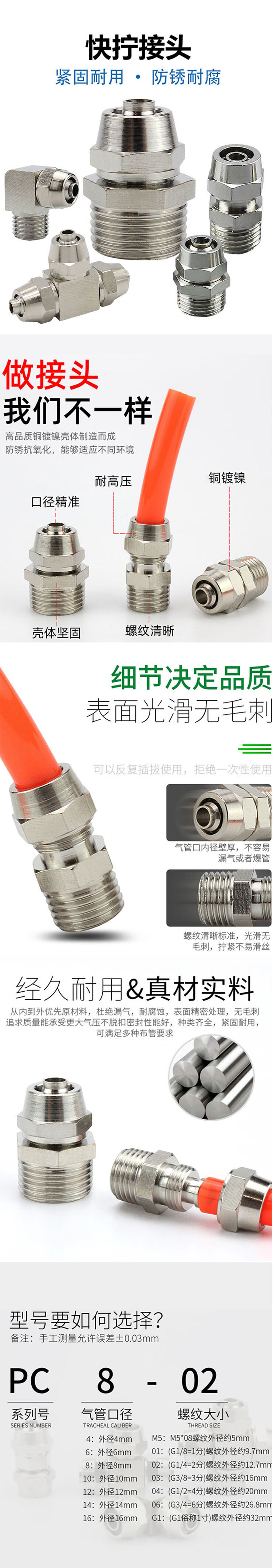 3 选型精度:型号选择需参考系列号、气管口径、螺纹大小的对应关系(如PC系列中,气管口径涵盖4mm、6mm、8mm、10mm、12mm、14mm、16mm等,螺纹大小对应M5、01(G1/8 - 1分)、02(G1/4 - 2分)、03(G3/8 - 3分)、04(G1/2 - 4分)、06(G3/4 - 6分)、G1(G1 - 1寸)等);手工测量允许误差±0.03mm,保障型号匹配精度