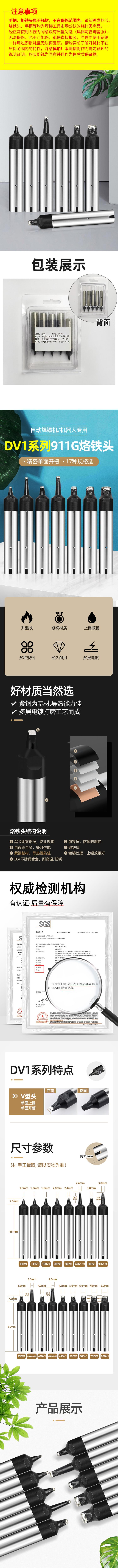 专为自动焊锡机、焊锡机器人设计,适配精准;基材选用紫铜,导热能力优异,经多层电镀打磨工艺制成,结构层包含黑金刚镀铬层(防止焊锡攀爬)、镀镍层(防锈防腐)、电镀铝合金(提升性能)、镀铁层、镀锡处理(增强上锡效果)、304不锈钢管套(耐高温、防锈);采用V型头结构,单面上锡、单面开槽,搭配精密单面开槽工艺,焊接精度高;升温速度快,上锡过程顺畅,焊接效率与质量双优,且经久耐用;提供17种规格(如1.0DV1、1.3DV1、1.6DV1等),覆盖多样焊接需求;通过SGS权威检测,铅、六价铬等测试结果符合欧盟RoHS指令(2015/863)限值要求,品质可靠。