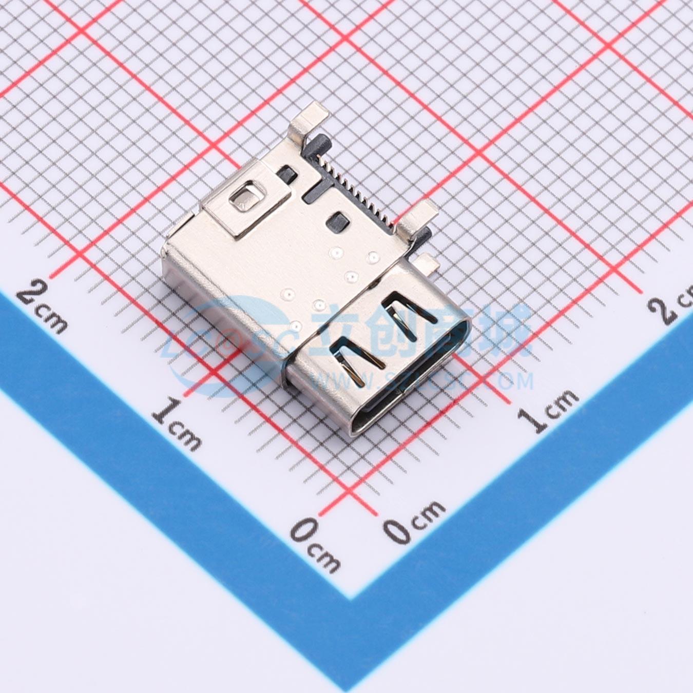 - ST-C-24P-CL03-14.3 TYPE-C 24PIN母座 侧立式贴片 四脚插板 SMT带弹片 L=14.3mm 编带包装 RoHS