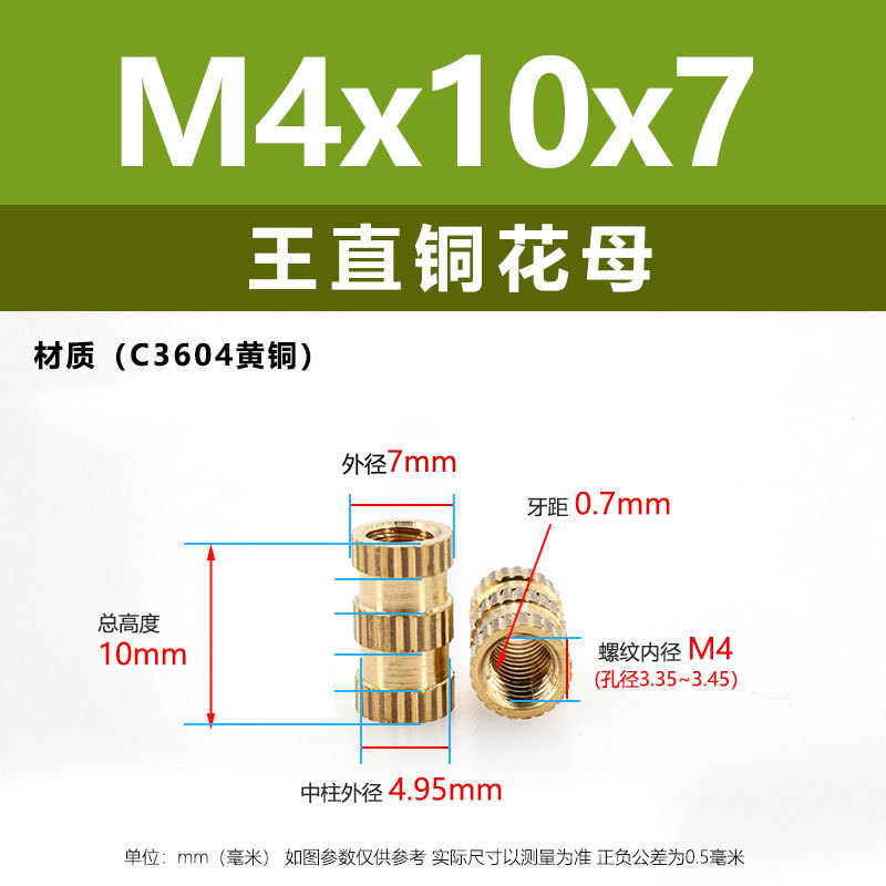 新宏辉达 工王直铜热熔注塑螺母工直通孔嵌件预埋滚花铜螺母M4*10*7 SZGZ0934
