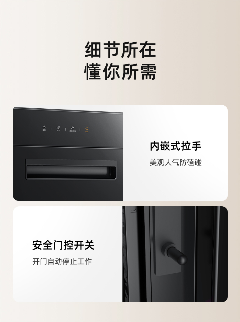 嵌入式设计:内嵌式拉手美观防磕碰,支持半嵌入式/全嵌入式安装,节省厨房空间