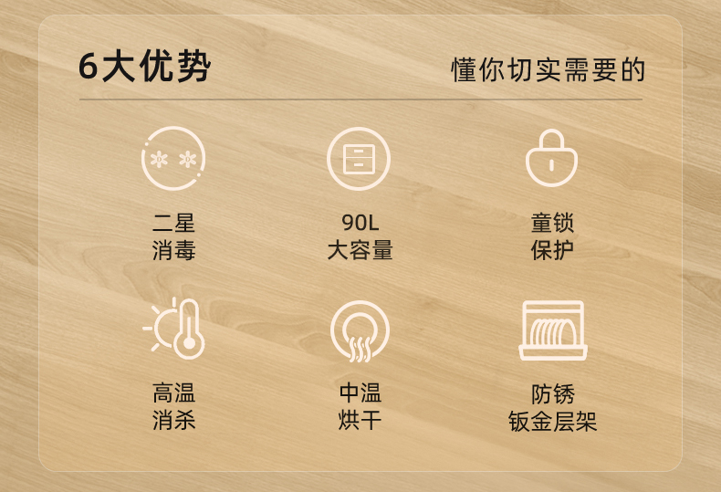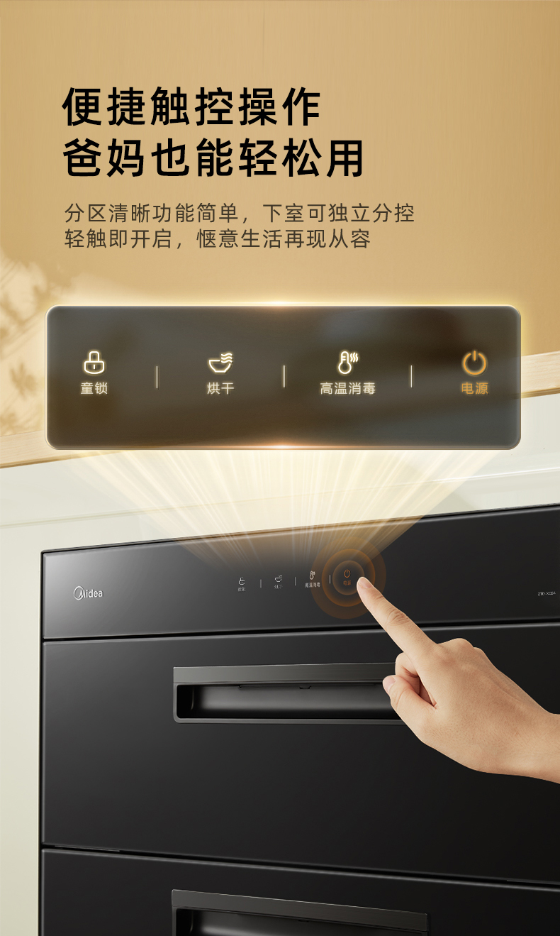 便捷触控操作:面板功能清晰(童锁、烘干、高温消毒、电源),老人也能轻松使用