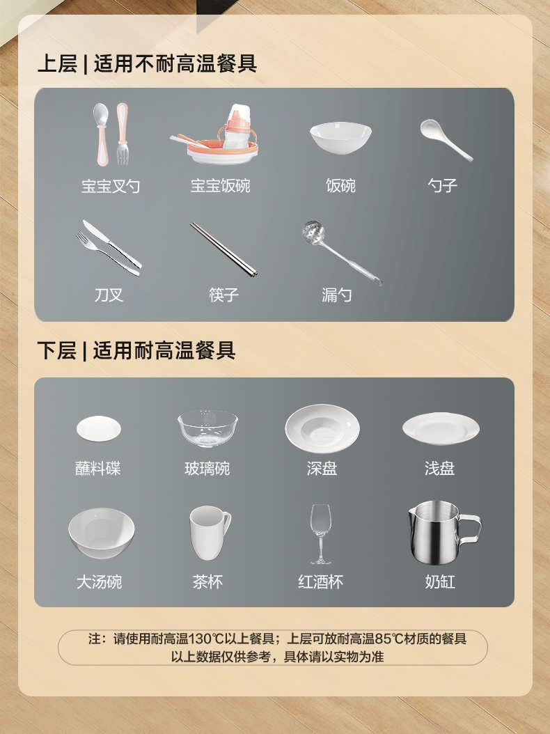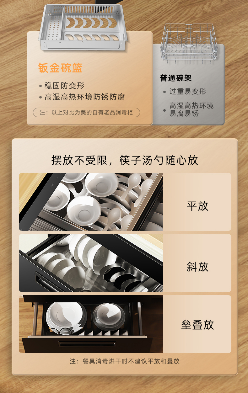 餐具放置要求:下层禁止放入不耐温餐具(塑料、橡胶、木质等);柜内禁止放入非餐具(如洗碗布、毛巾等);消毒烘干时不建议餐具平放或叠放