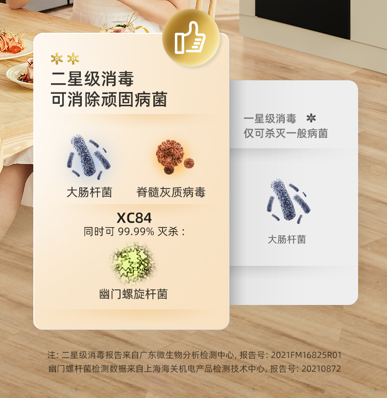 二星级消毒标准:可99.99%杀灭大肠杆菌、脊髓灰质炎病毒、幽门螺旋杆菌等顽固病菌,消毒效果更彻底