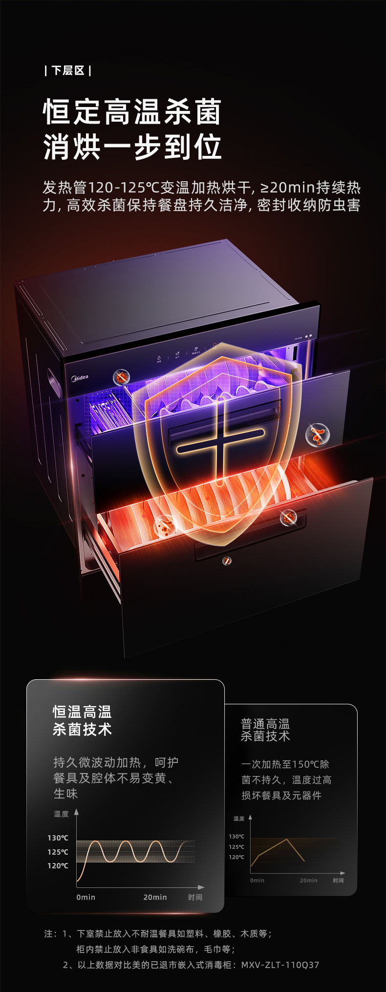 高温消毒烘干:下层采用120-125℃变温加热烘干,≥20min持续热力杀菌;上层65℃处理,兼顾消毒与烘干