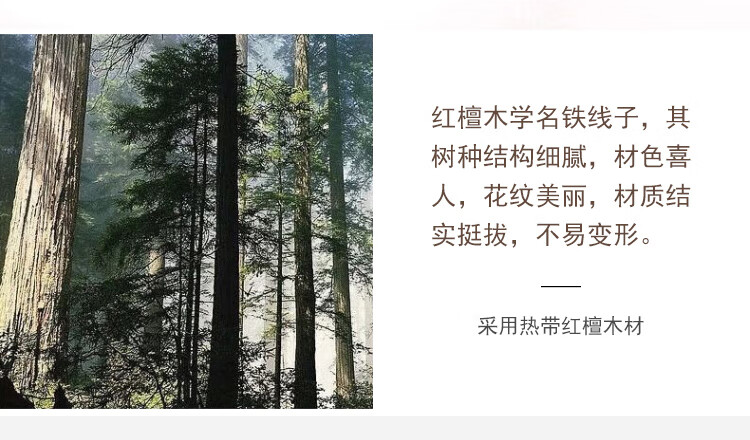 1 材质选用红檀木(学名铁线子),树种结构细腻,材质结实挺拔,不易变形