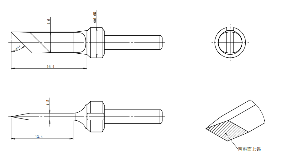 头部形状为刀型设计,两斜面上锡结构,有利于提升焊接面积与导热效率