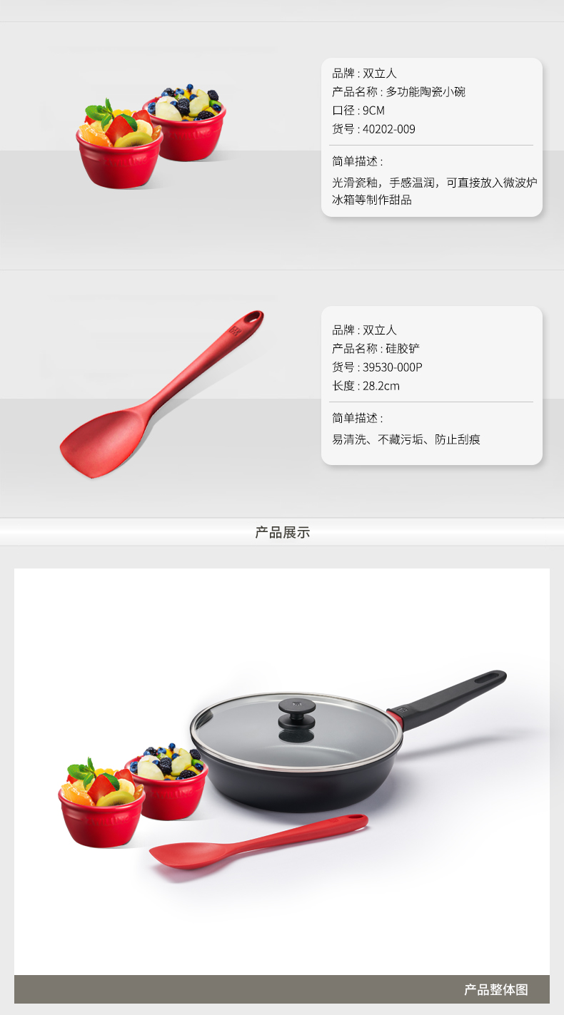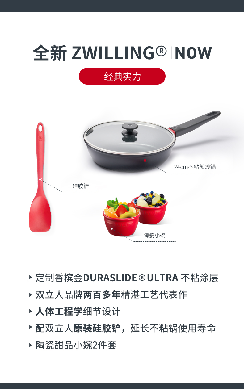 套装包含24cm不粘煎炒锅、双立人原装硅胶铲、陶瓷甜品小碗2件套