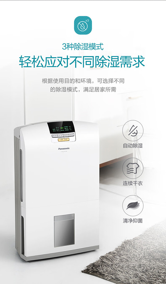功能模式:支持自动除湿、连续干衣、清净抑菌3种模式,满足不同场景需求
