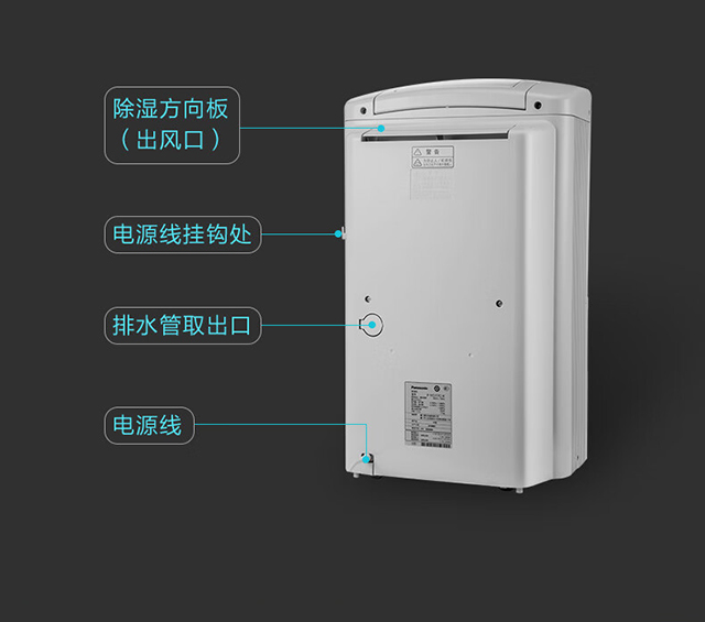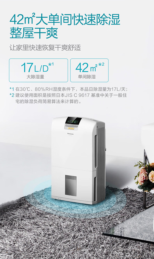 除湿能力:30℃、80%RH环境下除湿量17L/D,27℃、60%RH环境下10L/D,适用面积约42㎡(按日本JIS C9617基准)