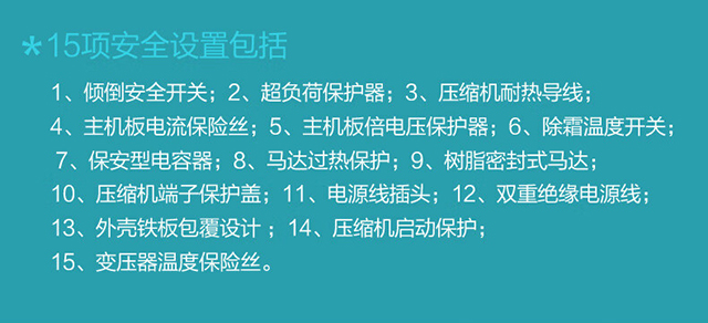 安全防护:15项安全装置,包括倾倒断电、多重防火、松下压缩机品质保障、马达过热保护等