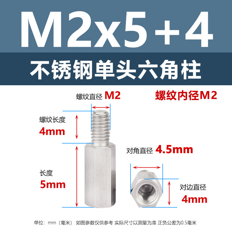 规格参数清晰:螺纹直径M2、螺纹长度4mm、主体长度5mm,尺寸公差控制在±0.5mm范围内