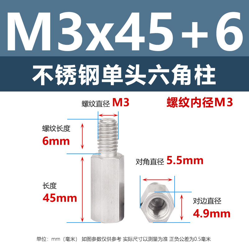 规格为M3*45+6,螺纹直径M3,螺纹长度6mm,整体长度45mm,尺寸精准,正负公差控制在0.5mm内