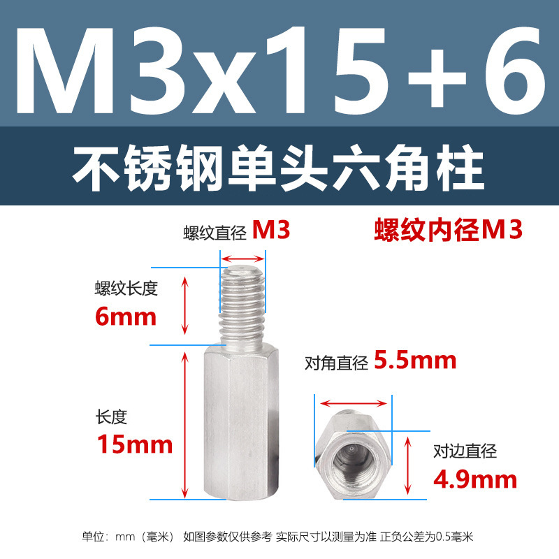 规格为M3*15+6,螺纹直径M3,螺纹长度6mm,整体长度15mm,对角直径5.5mm,正负公差0.5mm,尺寸精度高,适配性强