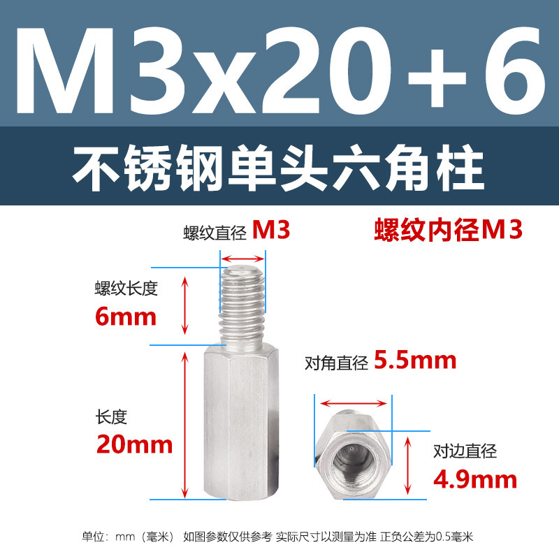 规格为M3×20+6,螺纹直径M3,螺纹长度6mm,整体长度20mm,螺纹精度符合标准,安装稳固不易松动