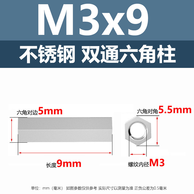 规格为M3×9mm,螺纹内径匹配M3螺丝,整体长度9mm,正负公差控制在0.5mm内,尺寸精度较高