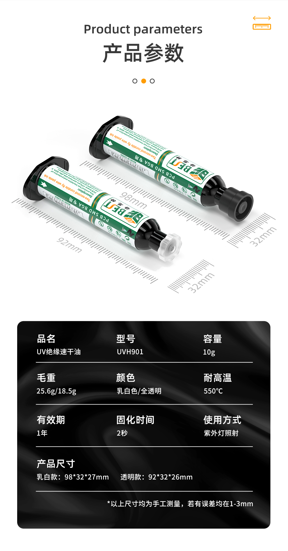 半透明乳白色胶体,便于涂抹时观察焊接位置,底部不见光区域也可固化