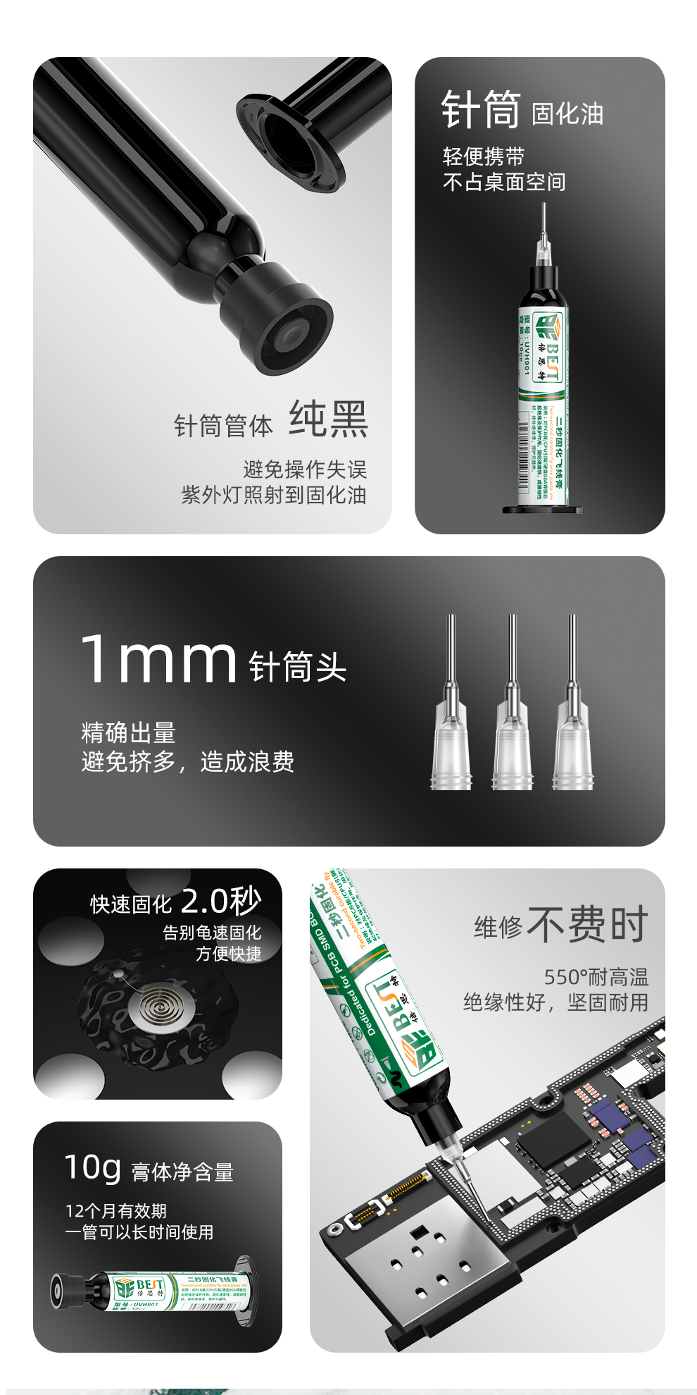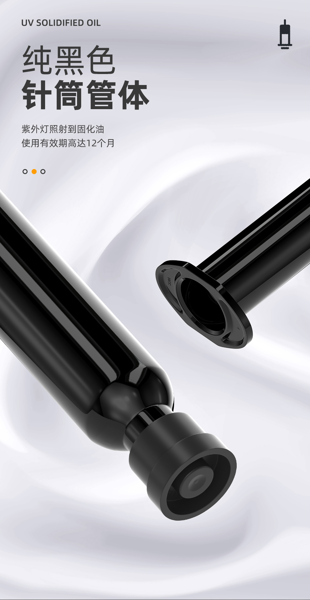 纯黑色针筒管体,避免未使用时紫外线照射导致误固化,延长有效期至12个月