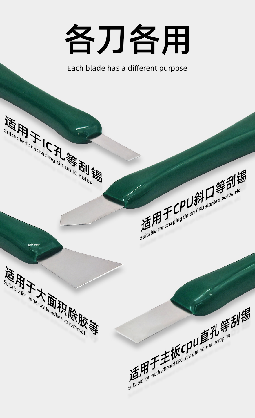 7 多用途适配:支持IC孔刮锡、CPU斜口/直孔刮锡、大面积除胶、锡浆搅拌、BGA撬取等操作