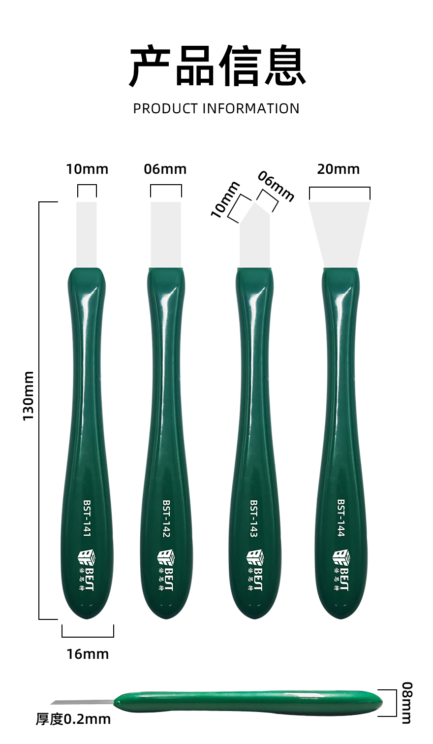 8 规格参数:总长130mm,手柄宽度16mm,刀头宽度可选(如10mm、6mm、20mm等)