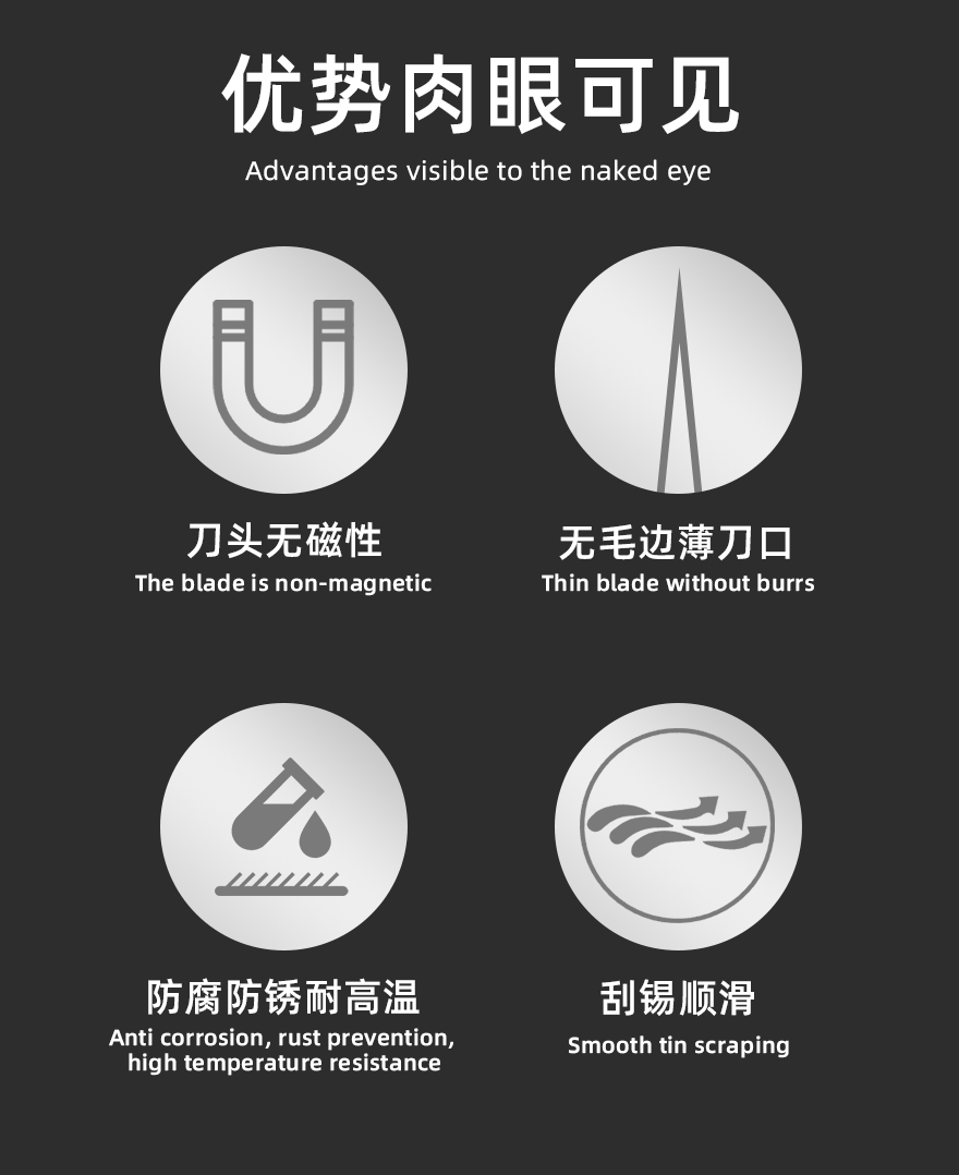 3 无毛边薄刀口:超薄设计(厚度0.2mm),刮锡顺滑无毛刺