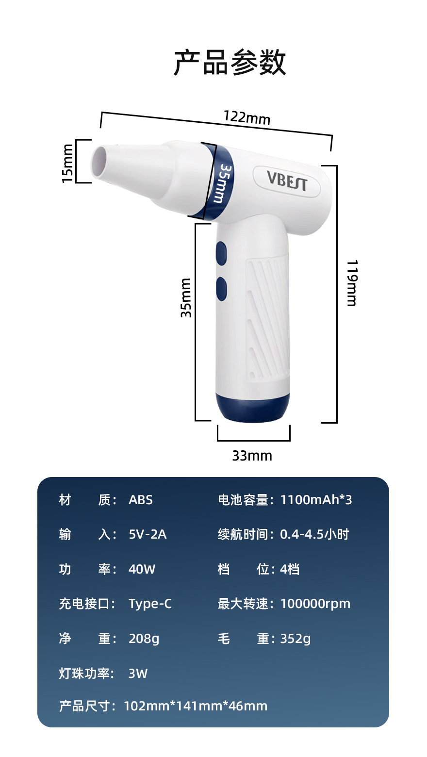 内置1100mAh*3大容量电池,续航时长0.4-4.5小时,Type-C接口充电便捷