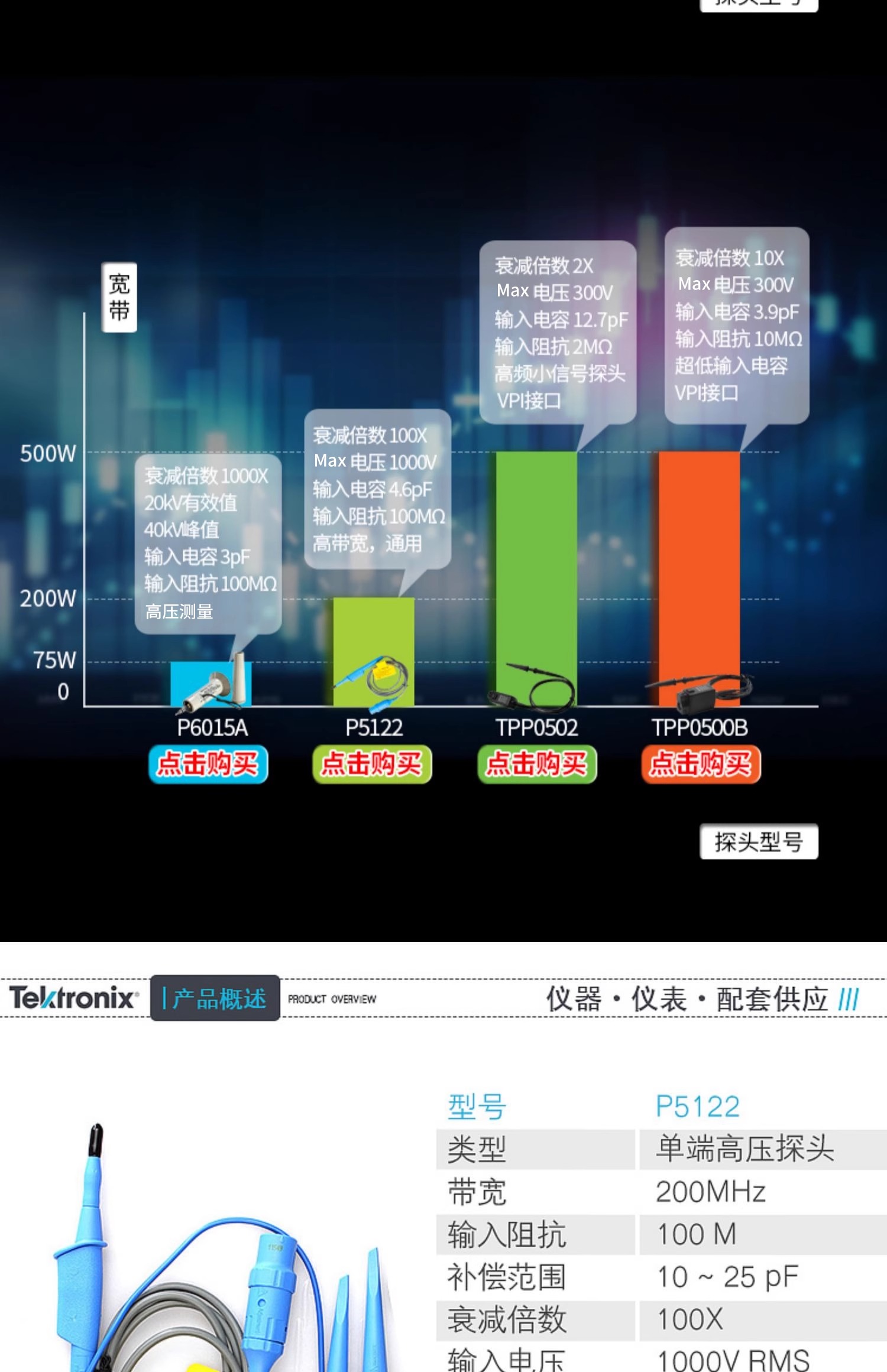 TEKTRONIX P6015A 泰克示波器高压单端探头带宽75MHz补偿范围7-49pF