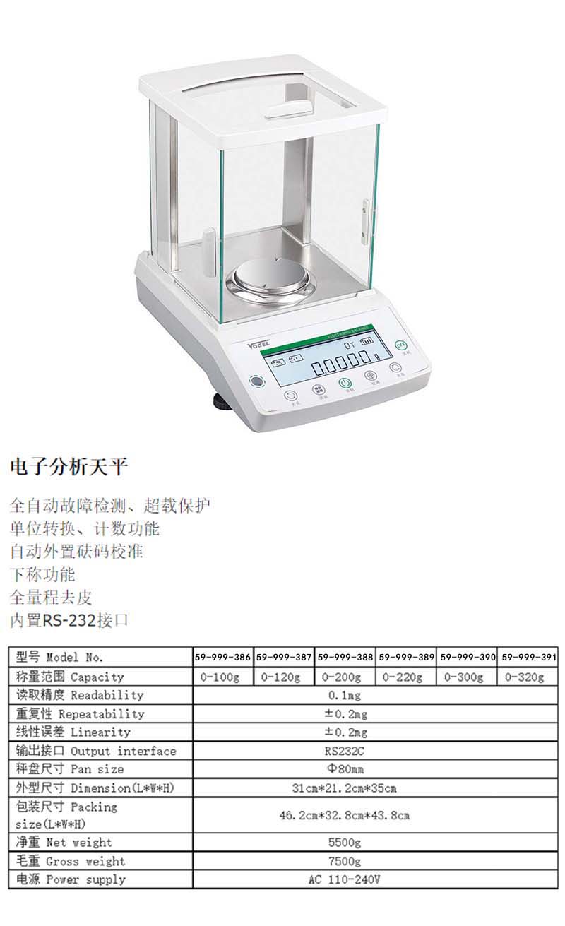 Vogel/沃戈耳 高清数显电子分析天平 0~300g 0.1mg