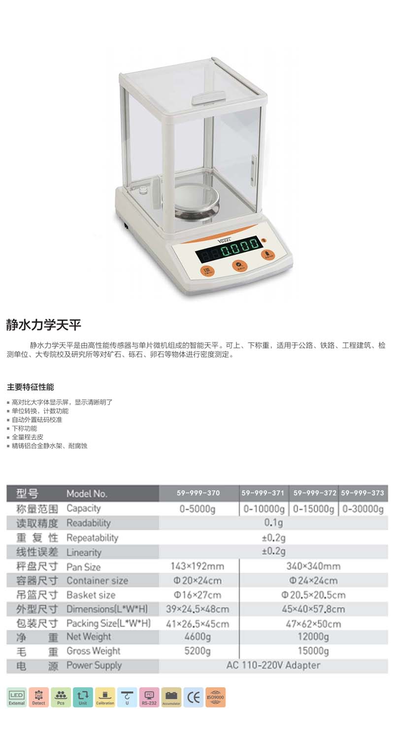 Vogel/沃戈耳 高清数显静水力学天平 0~5000g 0.1g