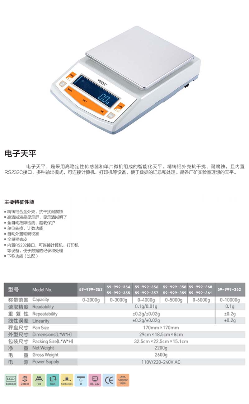 Vogel/沃戈耳 高清数显电子天平 方盘 0~5000g 0.1g
