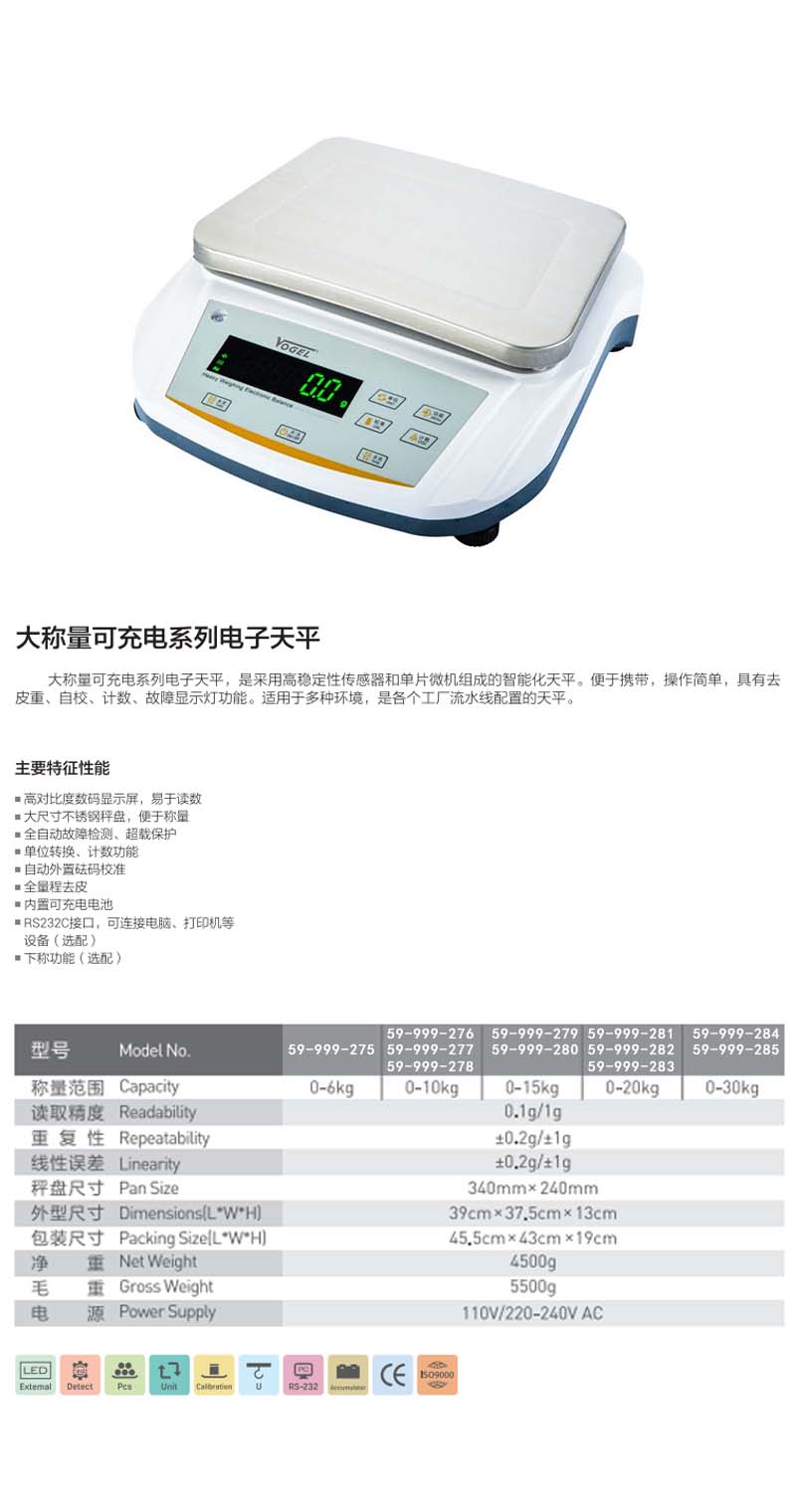 Vogel/沃戈耳 高清数显大称量可充电电子天平 称量范围 0~30kg 读取精度 1g