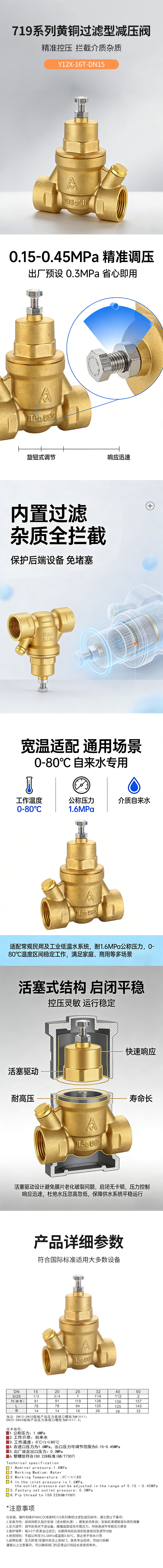 压力调节精准:公称压力1.6MPa,出口压力可在0.15-0.45MPa范围调节,出厂预设0.3MPa,满足不同设备压力需求
