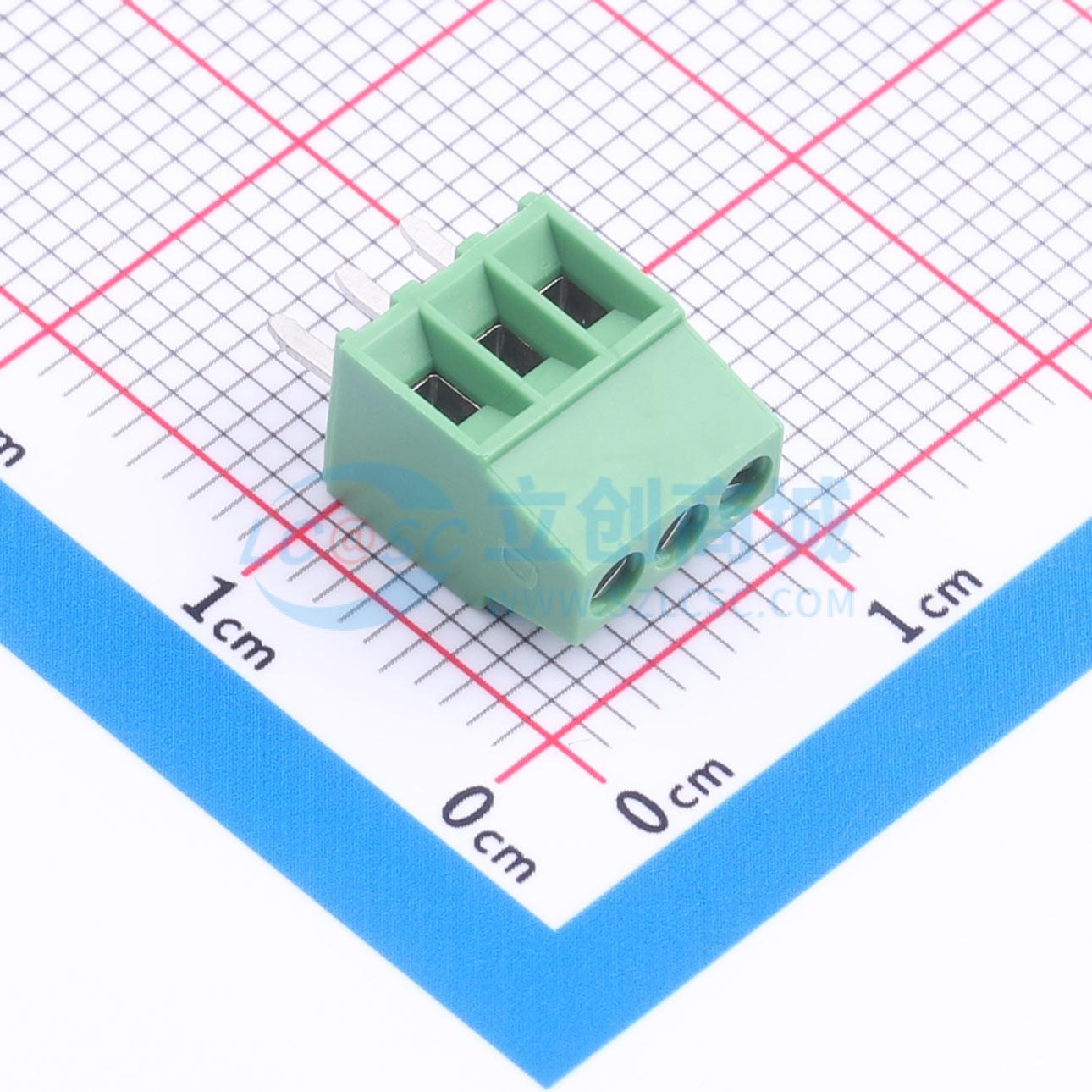 - 3 位 PCB 接线端子排、插头,线对板连接,中心线间距 2.54 mm [.1 in],1 排,导线接入角度 90°,适用导线规格 30-16 AWG、线径 .05-1.3 mm²