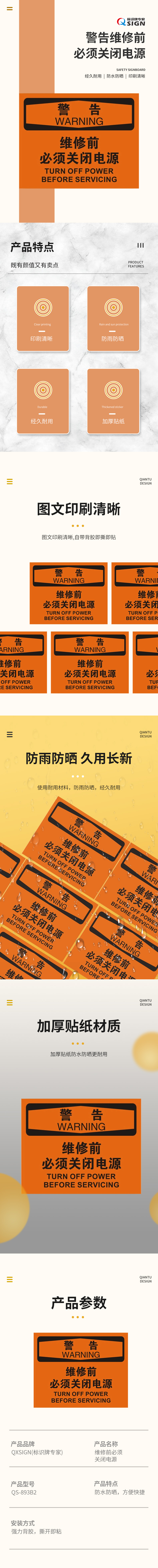 印刷清晰:图文印刷清晰,自带背胶,撕即贴,能让人员快速识别“维修前必须关闭电源”的警示内容,信息传递明确高效