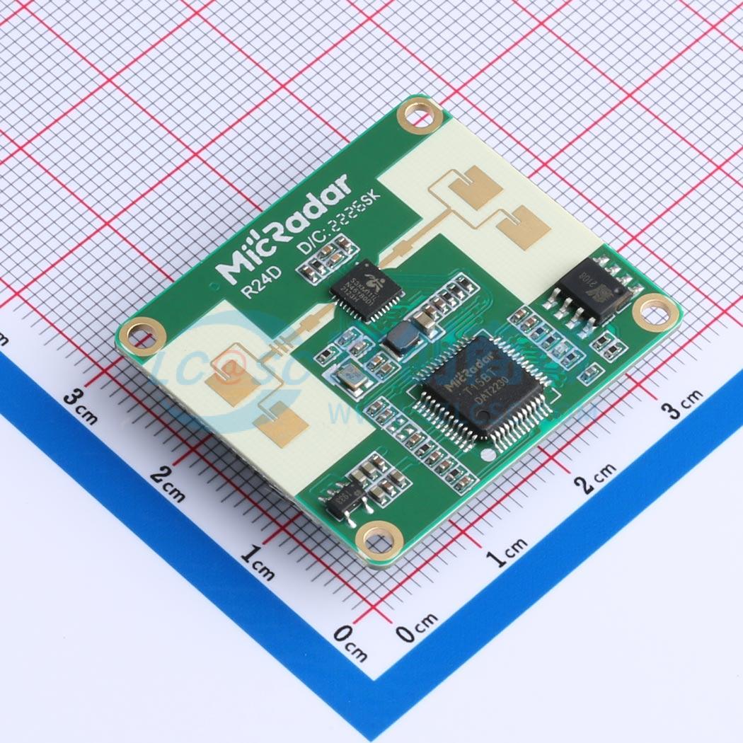 - R24DVD1 雷达模块是采用毫米波雷达技术,实现人体运动距离和速度感知的雷达探测模块。本模块基于 1T1R 调频连续波信号处理机制,通过对人员运动的强度及人员生理胸腔起伏参数的同步感知技术,实现特定场 所内人员状态的无线感知。