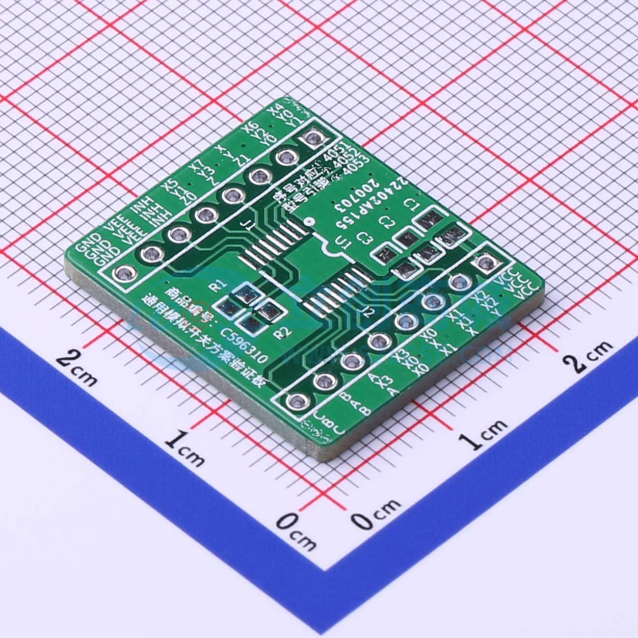 PCB空板 该验证板可测试4051、4052、4053等常用的模拟开关芯片。兼容SOP-16和TSSOP-16两种封装,所有的引脚功能已经引出,方便用户测试。