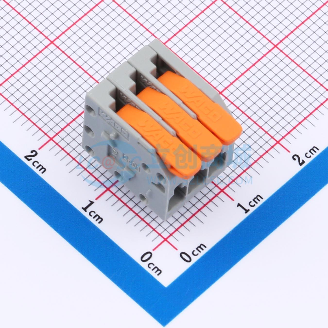 - PCB 接线端子; 操作手柄; 1.5 mm2; 焊针间距 3.5 mm; 3极; 推入式笼夹; 1,50 mm2; 灰色