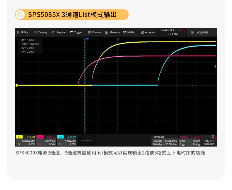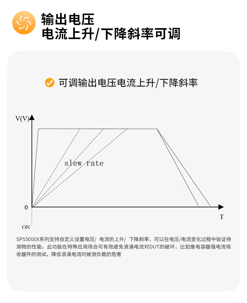 2可调输出电压电流上升/下降斜率:支持自定义设置电压/电流的上升/下降斜率,有效避免浪涌电流对DUT的破坏。