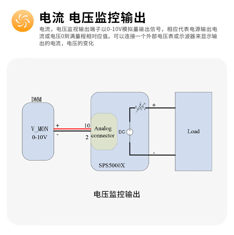 8电流电压监控输出:电流、电压监视输出端子以0-10V模拟量输出信号,连接外部电压表或示波器显示变化。
