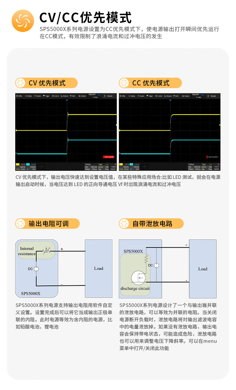 3CV/CC优先模式:设置为CC优先模式下,电源输出打开瞬间优先运行在CC模式,限制浪涌电流和过冲电压。