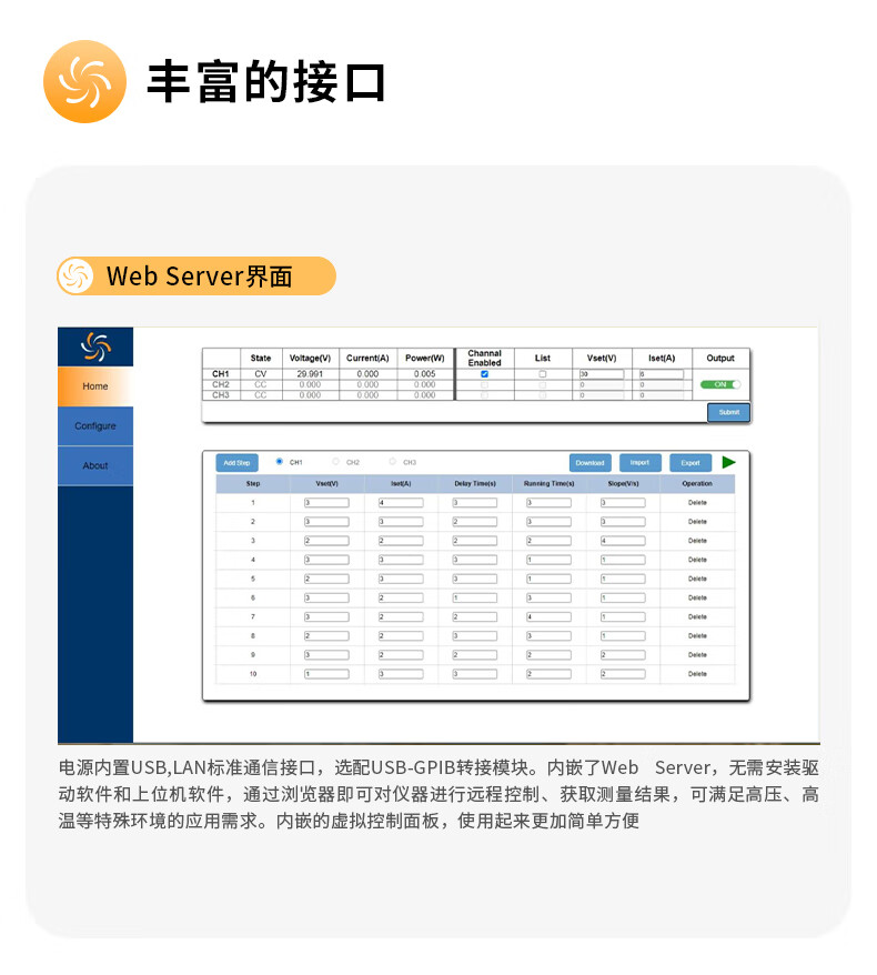 10丰富的接口:内置USB, LAN标准通信接口,选配USB-GPIB转接模块,内嵌Web Server,远程控制简单方便。
