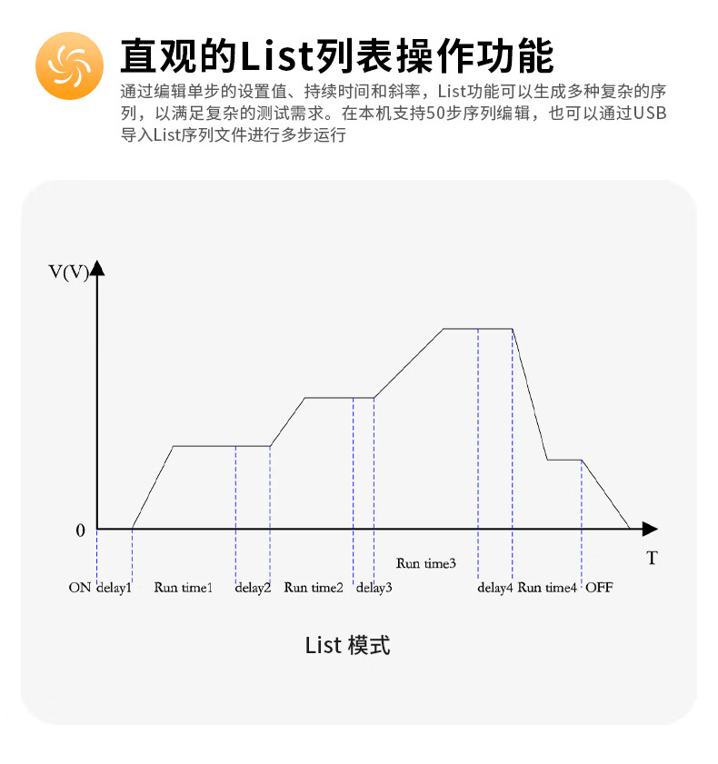 6直观的List列表操作功能:通过编辑单步的设置值、持续时间和斜率,生成复杂序列,满足测试需求。