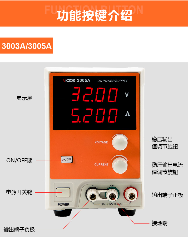 1高精度输出:VICTOR VC3005A直流稳压电源提供0-30V电压和0-5A电流的连续可调输出,电压和电流的调节精度高,确保实验和测试的准确性。